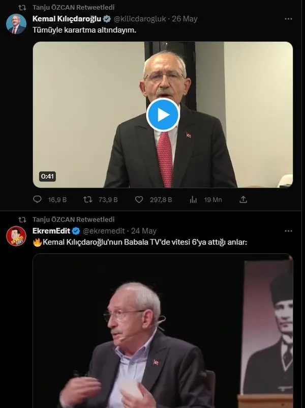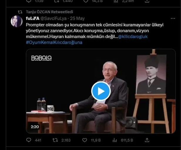 Seçimden önce, "Kemal Kılıçdaroğlu'nun Babala TV'de vitesi 6'ya attığı anlar", "Prompter olmadan şu konuşmanın tek cümlesini kuramayanlar ülkeyi yönetiyoruz zannediyor. Akıcı konuşma, üslup, donanım, vizyon mükemmel. Hayran kalmamak mümkün değil..." şeklindeki Kılıçdaroğlu'na övgüler yağdıran paylaşımları retweet ederek CHP Genel Başkanı'na oy isteyen Özcan, "Atam, şu anda senin kurduğun Cumhuriyet Halk Partisi başarısız insanlar tarafından yönetiliyor. Hatta bu gaflet içindeki CHP yönetimi partiyi 10 Aralıkçılara, Sorosçculara, terör sevicilere ve badem bıyıklılara peşkeş çekmeye çalışıyor. Hatta benim gibi Atatürkçüleri ihraç etmek suretiyle yıllardır mobbing ile partiden uzaklaştırmaya çalışıyor. İstiyorlar ki Atatürkçü gömleği çıkarsınlar." dedi.