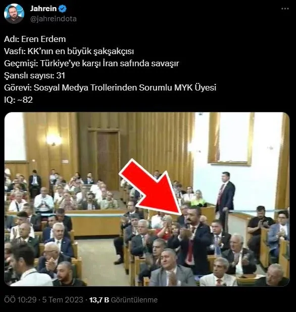 CHP yandaşı olarak bilinen Jahrein mahlaslı Ahmet Sonuç, Erdem'in Kılıçdaroğlu'nu alkışlamasıyla dalga geçti. Sosyal medyadan paylaşım yapan Sonuç, "Adı: Eren Erdem