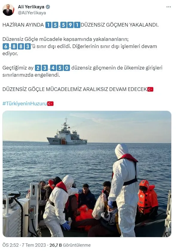 Son dakika haberleri... İçişleri Bakanı Ali Yerlikaya "Haziran ayında 15 bin 591 düzensiz göçmen yakalandı. 6 bin 880'ü sınır dışı edildi.