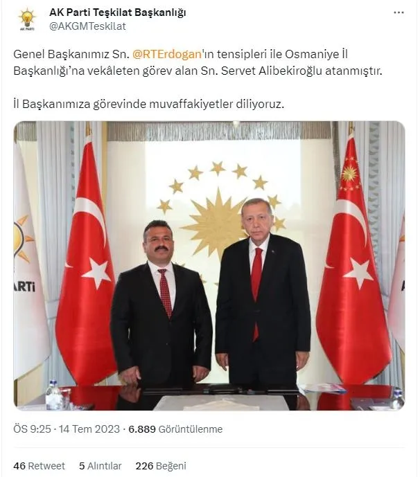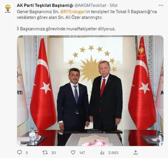 AK Parti Teşkilat Başkanlığının sosyal medya hesabından yapılan açıklamada, Başkan ve AK Parti Genel Başkanı Recep Tayyip Erdoğan'ın tensibiyle Tokat İl Başkanlığına Ali Özer ve Osmaniye İl Başkanlığına Servet Alibekiroğlu'nun atandığı belirtildi.