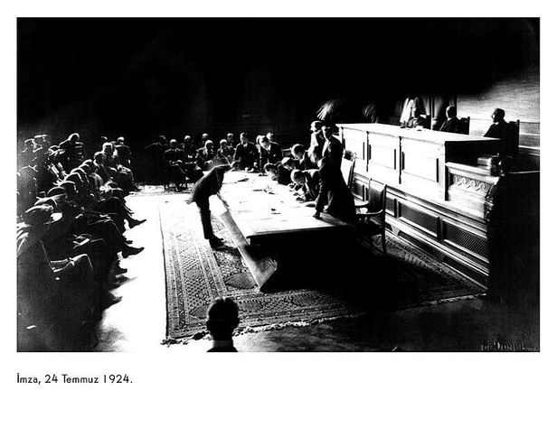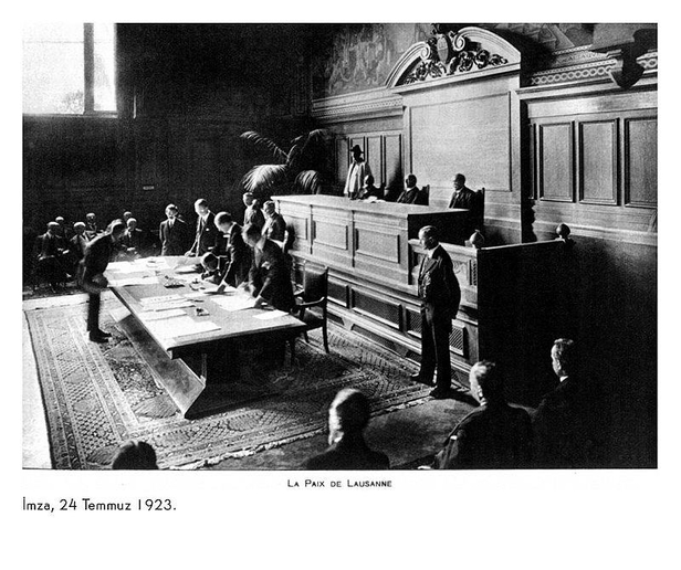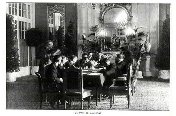 Türkiye Büyük Millet Meclisi (TBMM) temsilcileriyle Birleşik Krallık, Fransa, İtalya, Japonya, Yunanistan, Romanya, Bulgaristan, Portekiz, Belçika ve Yugoslavya temsilcilerince ağırlıklı olarak Leman Gölü kıyısındaki Beau-Rivage Palace'ta yapılan Lozan Barış Konferansı'nın ardından İsviçre'nin Lozan kentinde Rumine Sarayı'nda 24 Temmuz 1923'te antlaşma imzalandı.