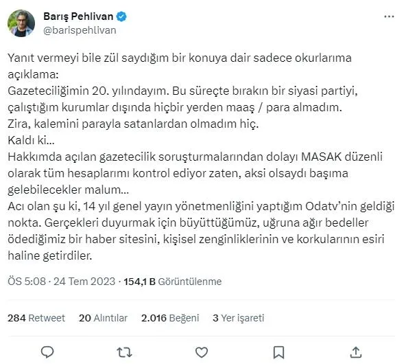 Yanıt vermeyi bile zül saydığım bir konuya dair sadece okurlarıma açıklama: Gazeteciliğimin 20. yılındayım. Bu süreçte bırakın bir siyasi partiyi, çalıştığım kurumlar dışında hiçbir yerden maaş / para almadım. Zira, kalemini parayla satanlardan olmadım hiç. Kaldı ki… Hakkımda açılan gazetecilik soruşturmalarından dolayı MASAK düzenli olarak tüm hesaplarımı kontrol ediyor zaten, aksi olsaydı başıma gelebilecekler malum… Acı olan şu ki, 14 yıl genel yayın yönetmenliğini yaptığım Odatv'nin geldiği nokta. Gerçekleri duyurmak için büyüttüğümüz, uğruna ağır bedeller ödediğimiz bir haber sitesini, kişisel zenginliklerinin ve korkularının esiri haline getirdiler.