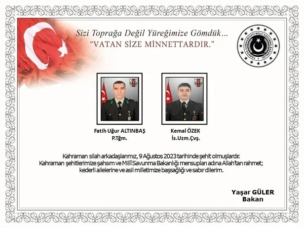 Bakanlıktan yapılan açıklamada, taciz ateşinde, Piyade Teğmen Fatih Uğur Altınbaş ve Uzman Çavuş Kemal Özek'in şehit düştüğü, 3 askerin yaralandığı belirtildi.