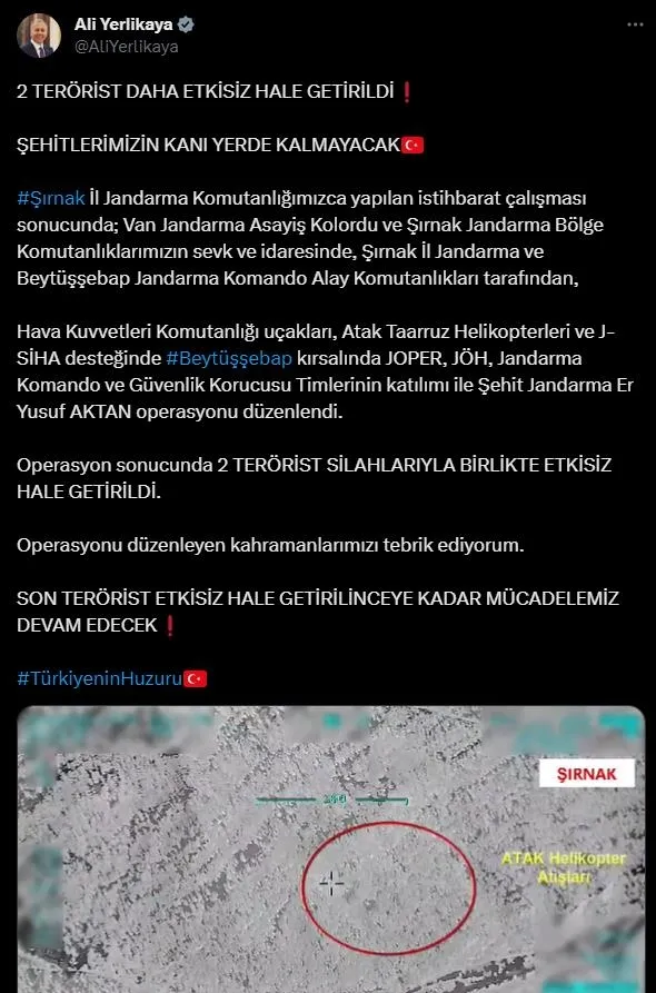 Savaş uçakları, Atak taarruz helikopterleri ve SİHA'ların da destek verdiği operasyonda 2 teröristin silahlarıyla etkisiz hale getirdiğini açıklayan Yerlikaya, "Operasyonu düzenleyen kahramanlarımızı tebrik ediyorum. Son terörist etkisiz hale getirilinceye kadar mücadelemiz devam edecek." ifadelerini kullandı.