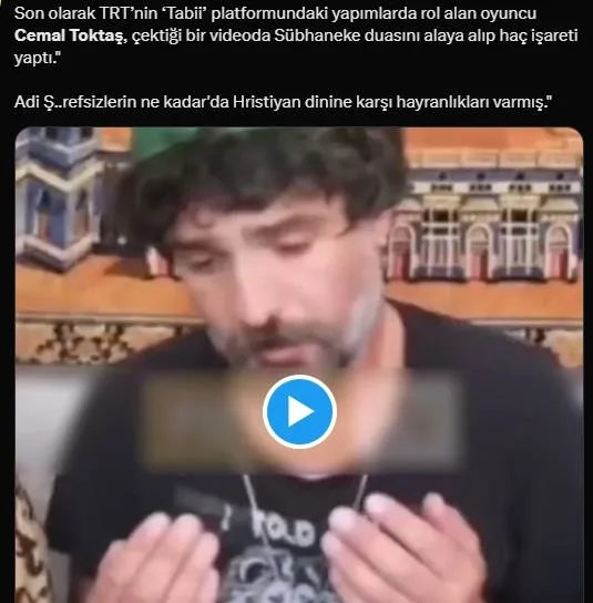 Son olarak TRT'nin 'Tabii' platformundaki yapımlarda rol alan oyuncu Cemal Toktaş, çektiği bir videoda Sübhaneke duasını alaya alıp haç işareti yaptı."
