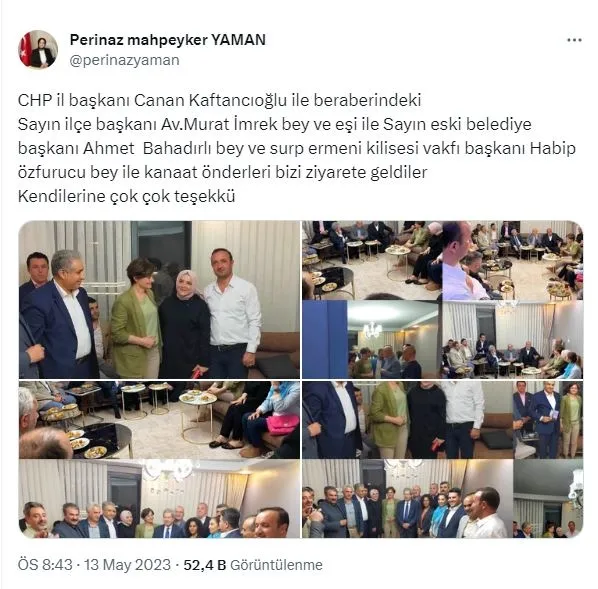 Fotoğrafları sosyal medya hesabından paylaşan Yaman'ın, "CHP il başkanı Canan Kaftancıoğlu ile beraberindeki Sayın ilçe başkanı Av.Murat İmrek bey ve eşi ile Sayın eski belediye başkanı Ahmet Bahadırlı bey ve surp ermeni kilisesi vakfı başkanı Habip Özfurucu bey ile kanaat önderleri bizi ziyarete geldiler. Kendilerine çok çok teşekkür" notunu düştüğü görüldü.