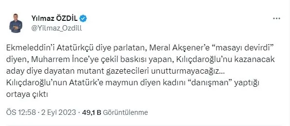 CHP yandaşı Yılmaz Özdil CHP'ye ve Kılıçdaroğlu'na yüklenerek, "Ekmeleddin'i Atatürkçü diye parlatan, Meral Akşener'e "masayı devirdi" diyen, Muharrem İnce'ye çekil baskısı yapan, Kılıçdaroğlu'nu kazanacak aday diye dayatan mutant gazetecileri unutturmayacağız… Kılıçdaroğlu'nun Atatürk'e maymun diyen kadını "danışman" yaptığı ortaya çıktı." ifadelerini kullandı.