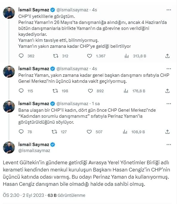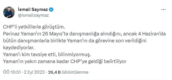 Saymaz ise "CHP'li yetkililerle görüştüm. Perinaz Yaman'ın 26 Mayıs'ta danışmanlığa alındığını, ancak 4 Haziran'da bütün danışmanlarla birlikte Yaman'ın da görevine son verildiğini kaydediyorlar. Yaman'ı kim tavsiye etti, bilinmiyormuş. Yaman'ın yakın zamana kadar CHP'ye geldiği belirtiliyor." dedi.