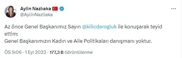 CHP'li Aylin Nazlıaka "Az önce Genel Başkanımız Sayın Kemal Kılıçdaroğlu ile konuşarak teyid ettim: Genel Başkanımızın Kadın ve Aile Politikaları danışmanı yoktur." dedi.