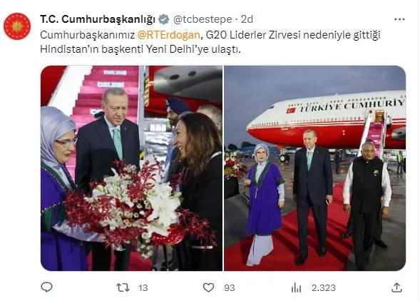 Söz konusu paylaşımda Başkan Erdoğan'ın çiçeklerle karşılandığı anlara yer verildi ve "G20 Liderler Zirvesi nedeniyle gittiği Hindistan'ın başkenti Yeni Delhi'ye ulaştı" ifadeleri kullanıldı.