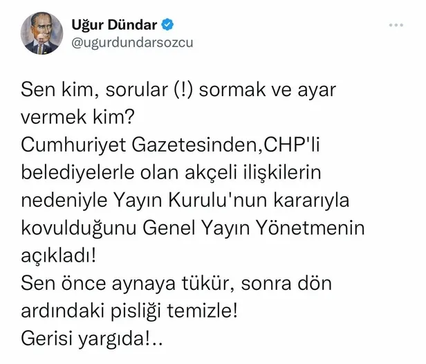 Dündar, Aysever'in yayınladığı videodan sonra yaptığı yeni paylaşımda ise, "Sen, kim sorular (!) sormak ve ayar vermek kim? Cumhuriyet Gazetesinden, CHP'li belediyelerle olan akçeli ilişkilerin nedenyile Yayın Kurulu'nun kararıyla kovulduğunu Genel Yayın Yönetmenin açıkladı! Sen önce aynaya tükür, sonra dön ardındaki pisliği temizle! Gerisi yargıda!" diye yazdı.