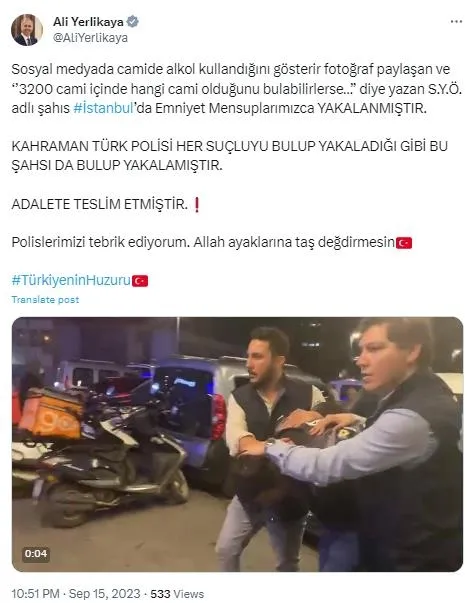 "Sosyal medyada camide alkol kullandığını gösterir fotoğraf paylaşan ve '3200 cami içinde hangi cami olduğunu bulabilirlerse...' diye yazan S.Y.Ö. adlı şahıs İstanbul'da emniyet mensuplarımızca yakalanmıştır. Kahraman Türk polisi her suçluyu bulup yakaladığı gibi bu şahsı da bulup yakalamıştır, adalete teslim etmiştir. Polislerimizi tebrik ediyorum. Allah ayaklarına taş değdirmesin."