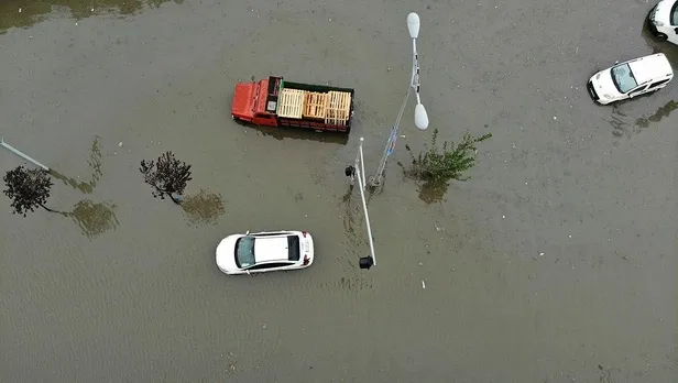 Yağmur suları nedeniyle araçlar sulara gömüldü. O anlar kameralara yansıdı.