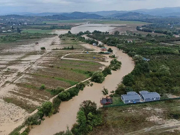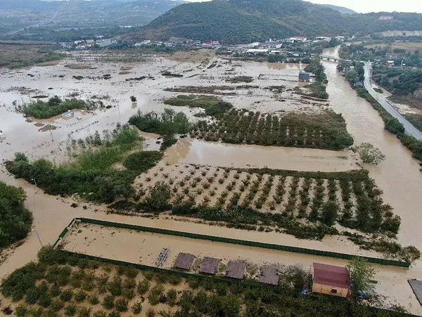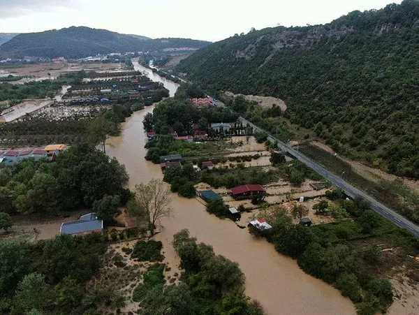 Şile'de etkili olan şiddetli yağış nedeniyle Yeşilçay Deresi taştı. Su altında kalan tarım arazileri, evler ve bungalovlar dron ile havadan görüntülendi.