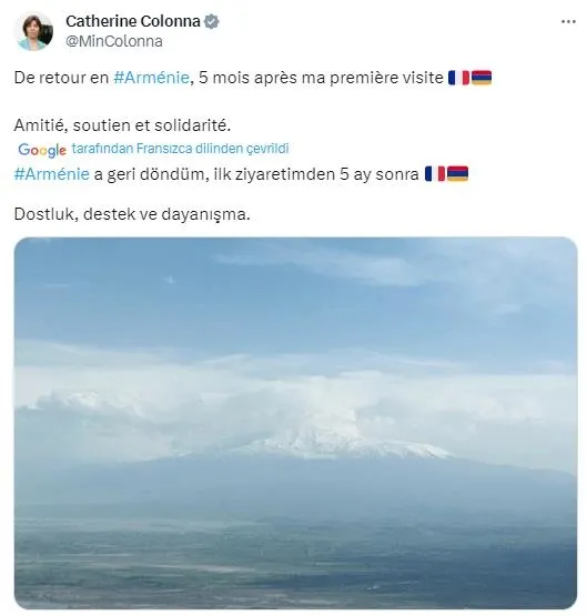 Fransa Dışişleri Bakanı Catherine Colonna'dan hadsiz Ağrı Dağı paylaşımı: Ermenistan'a geri döndüm