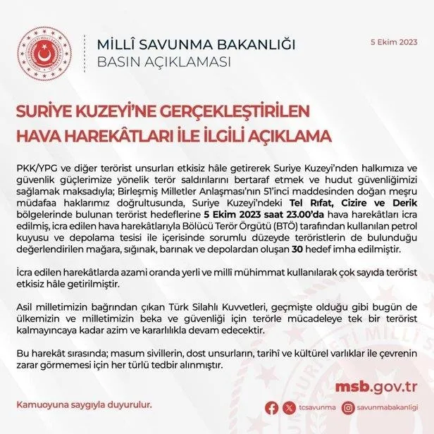 Milli Savunma Bakanlığı, (MSB) Suriye'nin kuzeyine yeni hava harekatı gerçekleştirildiğini bildirdi. Harekatta 30 terör hedefi imha edildi, çok sayıda terörist etkisiz hale getirildi.