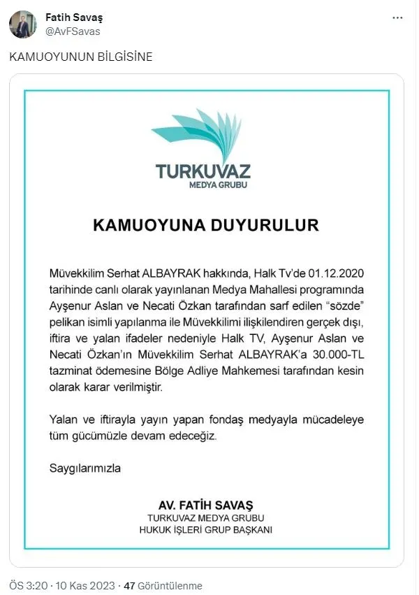 Turkuvaz Medya Grubu Hukuk İşleri Grup Başkanı Avukat Fatih Savaş, Bölge Adliye Mahkemesi'nin Halk TV, Ayşenur Arslan ve Necati Özkan'ın Dr. Serhat Albayrak'a tazminat ödemesini hükmettiğini duyurdu.