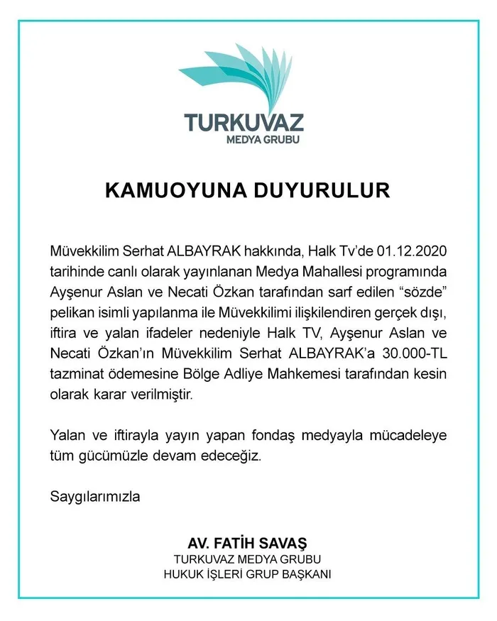 Müvekkilim Serhat Albayrak hakkında, Halk TV'de 01.12.2020 tarihinde canlı olarak yayınlanan Medya Mahallesi programında Ayşenur Arslan ve Necati Özkan tarafından sarf edilen sözde "pelikan" isimli yapılanma ile Müvekkilimi ilişkilendiren gerçek dışı, iftira ve yalan ifadeler nedeniyle Halk TV, Ayşenur Arslan ve Necati Özkan'ın Müvekkilim Serhat Albayrak'a 30.000 TL tazminat ödemesine Bölge Adliye Mahkemesi tarafından kesin olarak karar verilmiştir.