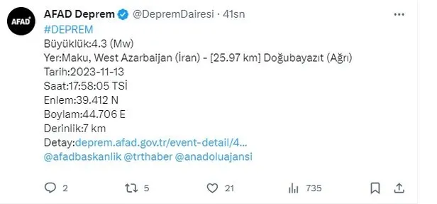 AFAD'dan yapılan açıklamada saat 17:58'de Türkiye-İran sınırında 4.3 büyüklüğünde bir deprem meydana geldiği duyuruldu.
