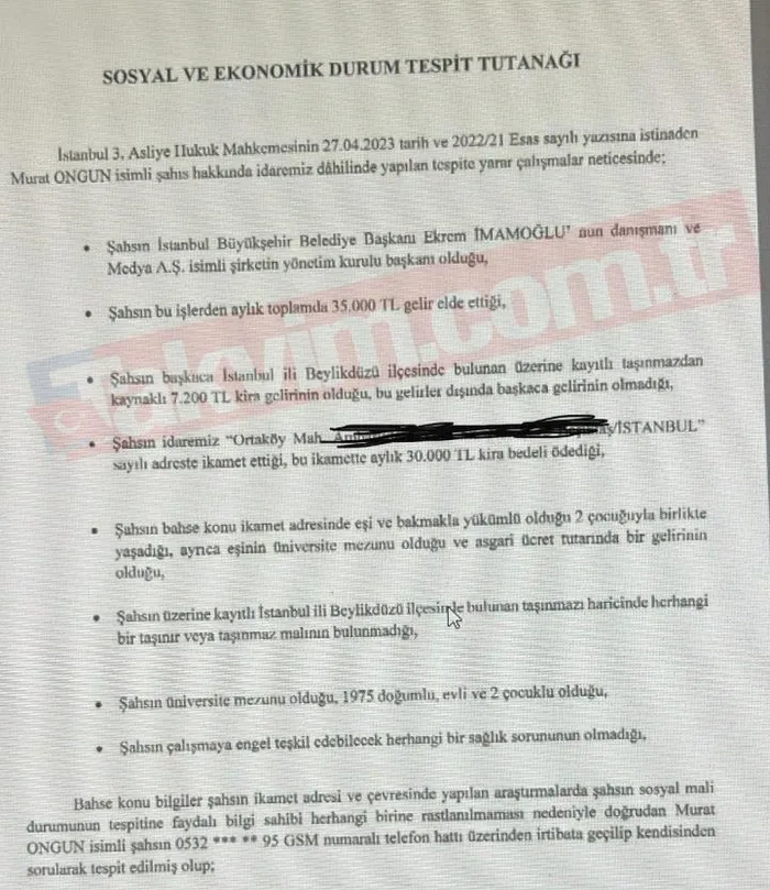 *Murat Ongun'un 35 bin TL aylık, 7200 lira kira getirisi, 30 bin TL kira ödemesi yaptığını gösteren gelir tutanağı*