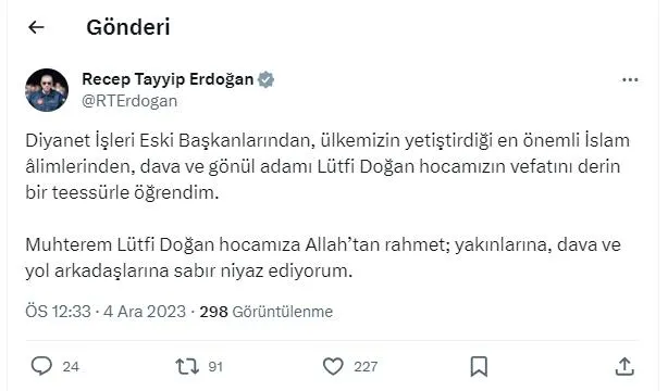 Erdoğan, "Diyanet İşleri Eski Başkanlarından, ülkemizin yetiştirdiği en önemli İslam âlimlerinden, dava ve gönül adamı Lütfi Doğan hocamızın vefatını derin bir teessürle öğrendim. Muhterem Lütfi Doğan hocamıza Allah'tan rahmet; yakınlarına, dava ve yol arkadaşlarına sabır niyaz ediyorum" ifadelerini kullandı.