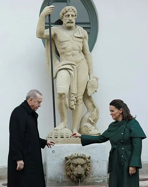 Başkan Erdoğan, Macaristan Cumhurbaşkanı Novak ile Sandor Sarayı'ndaki Neptün Havuzu'na "anı parası" attı.