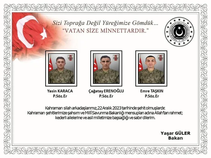 Kahraman Türk ordusunun sürdürdüğü Pençe harekatından acı haber geldi. Pençe 2 harekat bölgesinde Şehit Uzman Çavuş Alpay Aras 3 operasyonu kapsamında operasyon icra eden Dağ ve Komando Taburuna, terör örgütü mensupları tarafından sızma girişimi yaşandı. Komando taburu ile terör örgütü mensupları ile yaşanan çatışmada 3 askerimizin şehit olurken, 4 askerimizin de yaralandı. Şehitlerden birinin Sinop'un Boyabat ilçesine bağlı Yeşilyurt köyü nüfusuna kayıtlı Piyade Sözleşmeli Er Çağatay Erenoğlu olduğu öğrenildi.