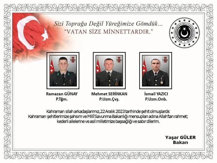 Milli Savunma Bakanlığı tarafından, Irak'ın kuzeyinde yaşanan saldırı ve sonrasında sağlanan çatışmada 6 askerin şehit olduğu açıklandı. Hain saldırıda şehit düşen, Afyonkarahisar-Sinanpaşa İlçesi Güney Beldesi Çalışlar Mahallesi nüfusuna kayıtlı olan ve Kara Kuvvetleri Komutanlığı/Hakkari Dağ ve Komando Tugay Komutanlığında görev yapan Piyade Teğmen Ramazan Günay'ın şehadet haberi, şehidin İzmir Buca ilçesi Hürriyet Mahallesi'nde yaşayan ailesine yetkililer tarafından ulaştırıldı.
