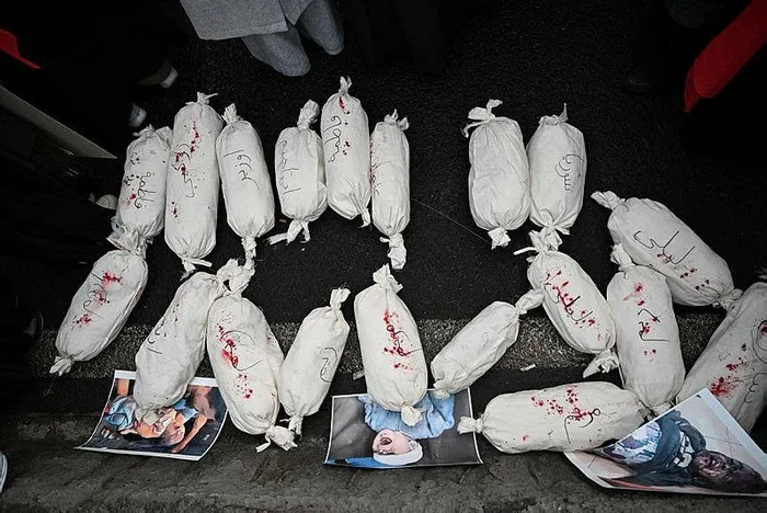 Yeni Camii'nin yakınında oluşturulan bir noktaya, Filistin'de öldürülen bebek ve çocukları temsilen kefene sarılmış bebek maketleri bırakıldı. Bazı katılımcılar da kucaklarında kefene sarılı temsili bebek maketi taşıdı.