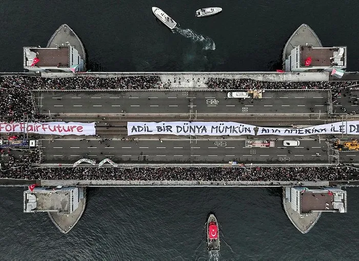 Son dakika haberi! Türkiye Gençlik Vakfının (TÜGVA) öncülüğünde, Milli İrade Platformu tarafından 308 STK'nin katılımıyla düzenlenen "Şehitlerimize Rahmet, Filistin'e Destek, İsrail'e Lanet" yürüyüşü için Galata Köprüsü'nde on binlerce kişi bir araya geldi. Sabah namazı sonrası Ayasofya Meydanı'nda toplanan vatandaşlar, "Şehitler ölmez vatan bölünmez", "İşbirlikçi hainler hesap verecek, katil İsrail hesap verecek", "Katil İsrail Filistin'den defol", "Kanımız canımız feda olsun Aksa'ya", "Hamas’a selam direnişe devam" sloganları attı. İlim Yayma Vakfı Mütevelli Heyeti Başkanı ve TÜGVA Yüksek İstişare Kurulu Üyesi Bilal Erdoğan, "Bizler kayıtsız kalamayız. Çünkü topraklarımız üzerinde gözü olanlar, Arz-ı Mevud safsatalarıyla milyonların kanına girenlerin gözlerini çıkarmak için bizler kayıtsız kalamayız. Filistin'deki soykırım ile 12 şehidimizin katillerinin aynı olduğunu biliyoruz" dedi.