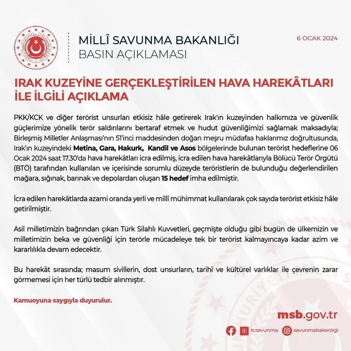 Bakanlıktan yapılan açıklamada, terör örgütü PKK/KCK'lı ve diğer terörist unsurların etkisiz hale getirilerek, Irak'ın kuzeyinden halka ve güvenlik güçlerine yönelik terör saldırılarını bertaraf etmek ve hudut güvenliğini sağlamak amacıyla Birleşmiş Milletler Anlaşması'nın 51'inci maddesinden doğan meşru müdafaa hakları doğrultusunda, Irak'ın kuzeyinde bulunan Metina, Gara, Hakurk, Kandil ve Asos bölgelerindeki terörist hedeflere bugün saat 17.30'da hava harekatları düzenlendiği belirtildi.