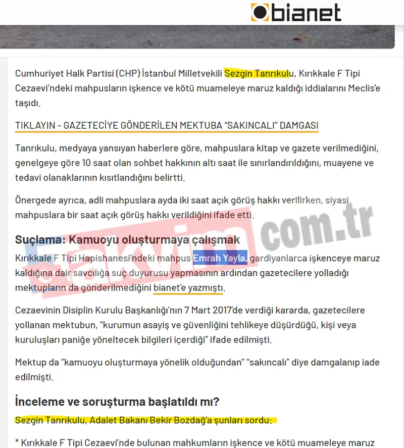 CHP ve DEM yandaşı yayınlar yapan bianet'te 2017'de yayınlanan bir habere göre Sezgin Tanrıkulu Emrah Yayla'nın işkence gördüğünü iddia ederek dönemin Adalet Bakanı Bekir Bozdağ'a sorular yöneltti.