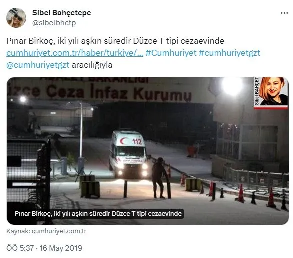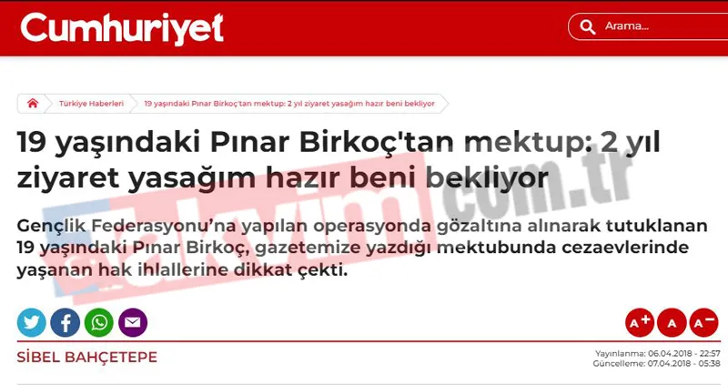 Cumhuriyet'te 2018 yılında yayınlanan haberde "Pınar Birkoç, gazetemize yazdığı mektubunda cezaevlerinde yaşanan hak ihlallerine dikkat çekti." ifadeleri yer aldı.