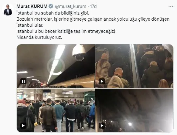 Cumhur İttifakı'nın İstanbul Büyükşehir Belediye (İBB) Başkan adayı Murat Kurum, sosyal medya hesabından yaptığı açıklamada, "İstanbul, bu sabah da bildiğiniz gibi. Bozulan metrolar, işlerine gitmeye çalışan ancak yolculuğu çileye dönüşen İstanbullular. İstanbul'u bu beceriksizliğe teslim etmeyeceğiz. Nisanda kurtuluyoruz." ifadelerini kullandı.