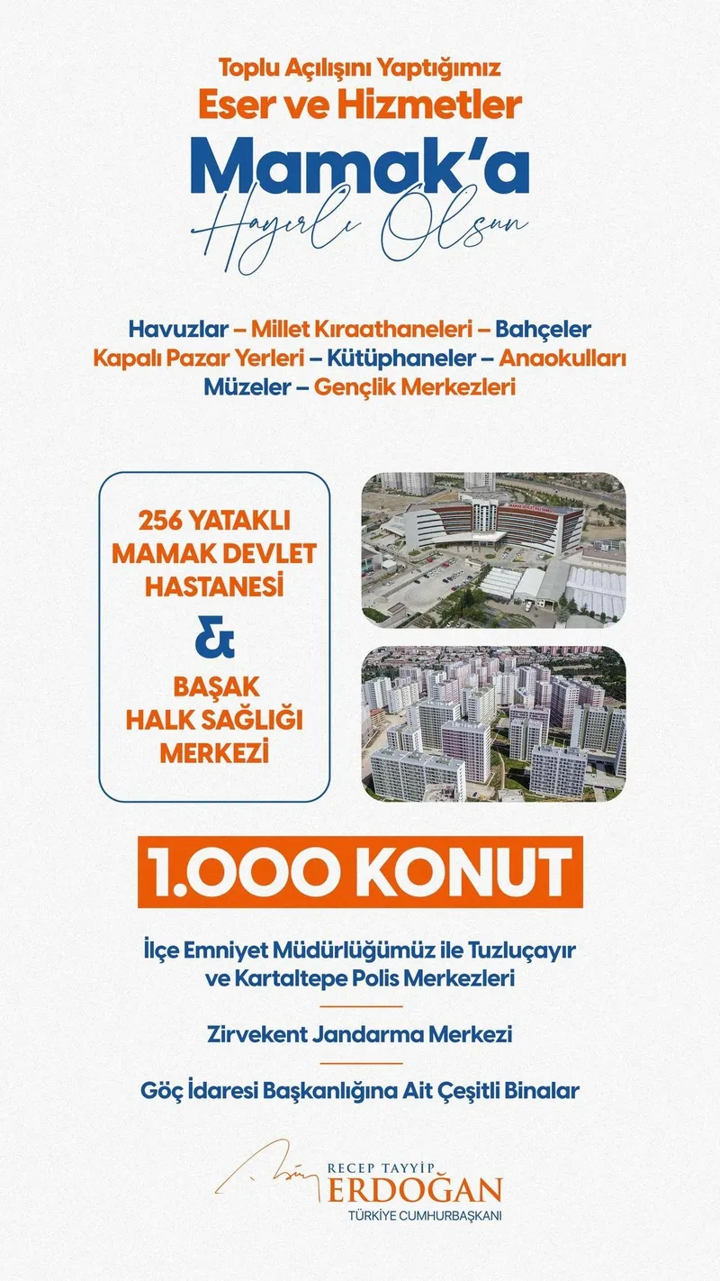 Bu projeler arasında, havuzlar, millet kıraathaneleri, bahçeler, kapalı pazar yerleri, kütüphaneler, anaokulları, müzeler, gençlik merkezlerinin bulunduğunu belirten Erdoğan, belediye yatırımlarıyla birlikte, bakanlıkların yaptığı eserleri de bugün resmen hizmete aldıklarını bildirdi. Erdoğan, "Bakanlıklarımız tarafından ilçemize kazandırılan sağlıkta 256 yataklı Mamak Devlet Hastanesi ve Başak Halk Sağlığı Merkezi'ni, TOKİ tarafından Diriliş ve Dutluk'ta inşa edilen toplam 1000 konutu, İlçe Emniyet Müdürlüğü ile Tuzluçayır ve Kartaltepe Polis Merkezlerini, Zirvekent Jandarma Merkezi'ni, Göç İdaresi Başkanlığına ait çeşitli binaları bugün resmen sizlerin hizmetine sunmuş oluyoruz." dedi.