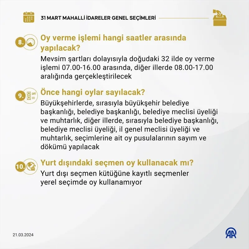 Adana, Ankara, Antalya, Aydın, Balıkesir, Bursa, Denizli, Diyarbakır, Erzurum, Eskişehir, Gaziantep, Hatay, İstanbul, İzmir, Kahramanmaraş, Kayseri, Kocaeli, Konya, Malatya, Manisa, Mardin, Mersin, Muğla, Ordu, Sakarya, Samsun, Şanlıurfa, Tekirdağ, Trabzon ve Van'daki seçmenler, "büyükşehir belediye başkanı", "belediye başkanı", "belediye meclis üyeliği" ile "muhtarlık ve ihtiyar heyeti" için oy kullanacak.