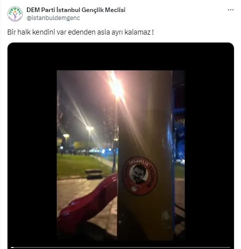 DEM Parti üzerinde bebek katili Abdullah Öcalan'ın fotoğrafının olduğu "Tecrit insanlık suçudur" yazılı stickerları sokak sokak gezerek direklere yapıştırdığı görüntüleri sosyal medya hesabı üzerinden paylaştı.