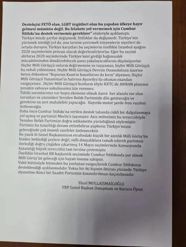 Yeniden Refah Partisi Genel Başkan Danışmanı Yücel Mollaismailoğlu'ndan 'yanlıştan dönün' çağrısı: Cumhur'a desteğini açıklamalı