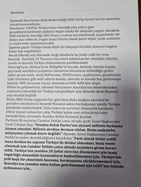Bizler, Milli Görüş çizgisinin her gün biraz daha uzağına savrulan bir partiden umudumuzu keserek Hocamız adına kurduğumuz vakıfla Türkiye genelinde teşkilatlandık. Daha sonra ise yarınları düşünerek hareketin tekrar siyaset sahnesine çıkıp Türkiye'mizin yeni atılımlarına ivme kazandırması arzusuyla Yeniden Refah Partimizi kurduk.