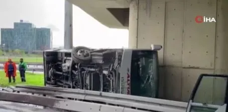 İstanbul Havalimanı'nda görevli polisleri taşıyan servis minibüsü, yağmurun da etkisiyle kayganlaşan yolda bariyerlere çarparak devrildi.
