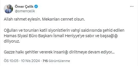 Ömer Çelik, "Allah rahmet eylesin. Mekanları cennet olsun. Oğulları ve torunları katil siyonistlerin vahşi saldırısında şehid edilen Hamas Siyasi Büro Başkanı İsmail Heniyye'ye sabır ve başsağlığı diliyoruz. Gazze halkı şehitler vererek insanlığı diriltmeye devam ediyor." ifadelerini kullandı.