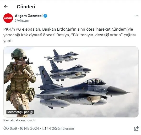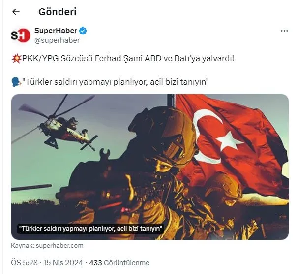 Superhaber isimli bir başka haber platformu "PKK/YPG Sözcüsü Ferhad Şami ABD ve Batı'ya yalvardı! "Türkler saldırı yapmayı planlıyor, acil bizi tanıyın" başlığıyla Takvim kaynaklı haberi okurlarına duyurdu.