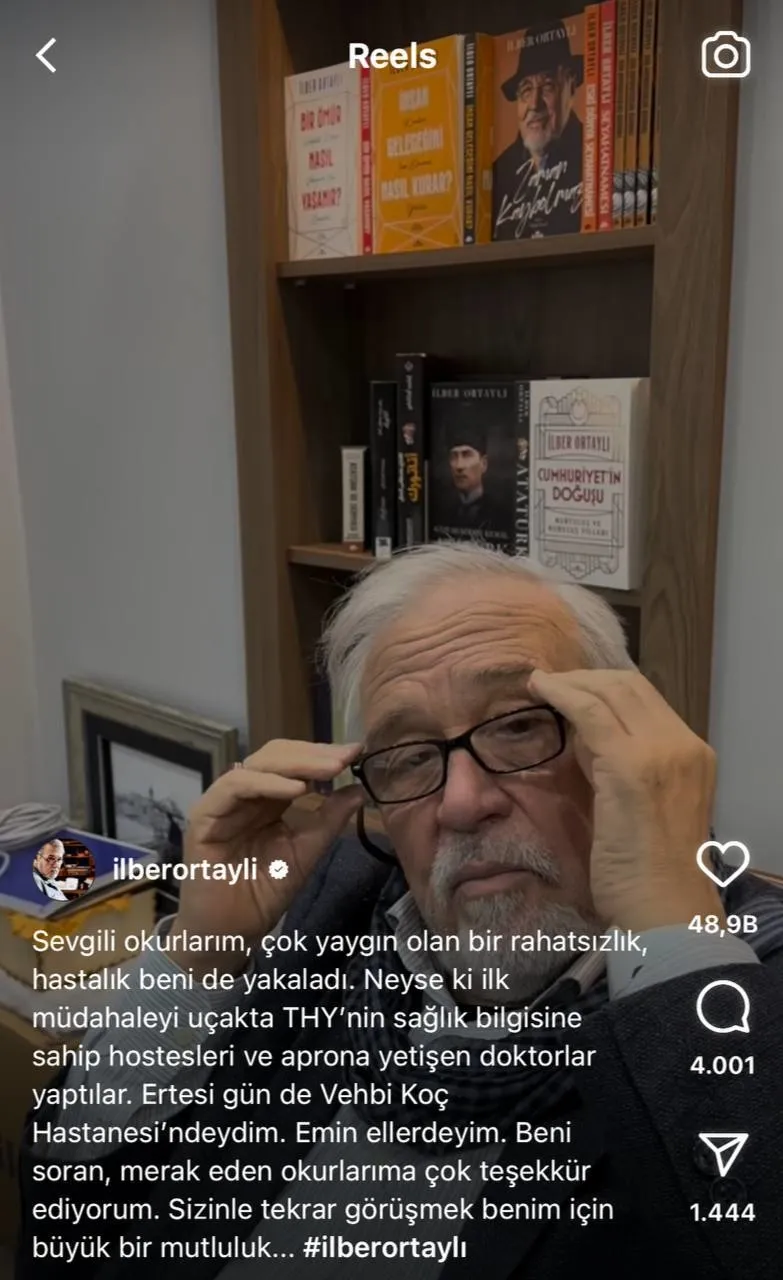 Sağlık durumu merak edilen İlber Ortaylı'dan bir açıklama geldi. Ortaylı, sosyal medya hesabından yaptığı açıklamada "Sevgili okurlarım, çok yaygın olan bir hastalık, beni de yakaladı. Neyse ki ilk müdahaleyi uçakta THY'nin sağlık bilgisine sahip hostesleri ve aprona yetişen doktorlar yaptı. Ertesi gün de Vehbi Koç Hastanesi'ndeydim. Emin ellerdeyim. Beni soran ve merak eden okurlarıma teşekkür ediyorum" ifadelerini kullandı.