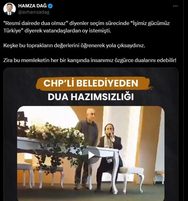 Sosyal medyadan CHP'li belediyedeki skandala tepki gösteren AK Parti Genel Başkan Yardımcısı Hamza Dağ, ""Resmi dairede dua olmaz" diyenler seçim sürecinde "İşimiz gücümüz Türkiye" diyerek vatandaşlardan oy istemişti. Keşke bu toprakların değerlerini öğrenerek yola çıksaydınız. Zira bu memleketin her bir karışında insanımız özgürce dualarını edebilir!" dedi.