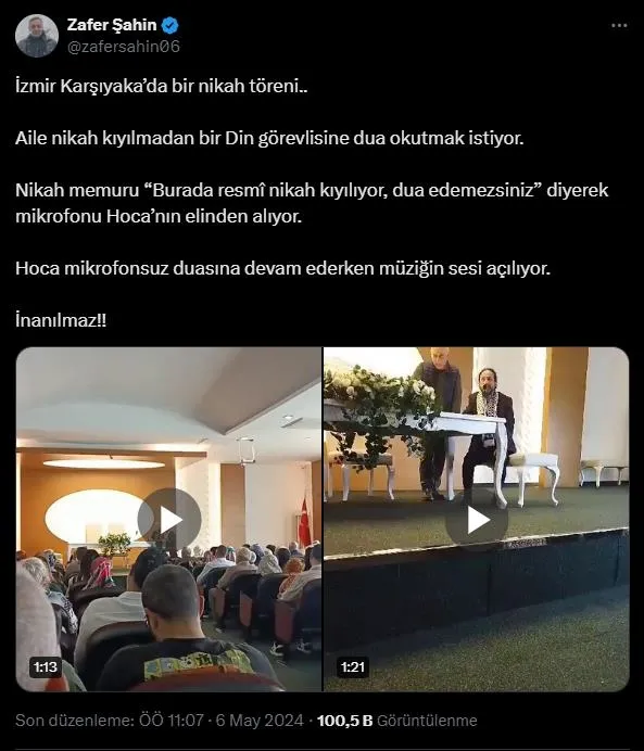 İzmir Karşıyaka'da kıyılan bir nikah merasimi öncesi çekilen görüntüler sosyal medyada büyük tepki çekti. Nikah öncesi dua etmek isteyen ailenin yakını bir hocaya müdahale eden nikah memuru, "Burada resmi nikah kıyılıyor, dua edemezsiniz” diyerek mikrofonu elinden aldı. Karşıyaka Cumhuriyet Başsavcılığı skandala imza atan nikah memuru hakkında soruşturma başlattı.