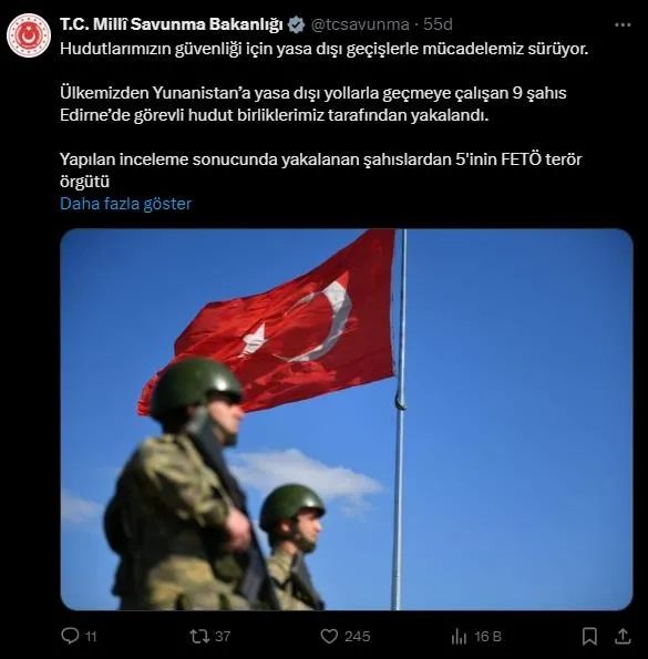 "Ülkemizden Yunanistan'a yasa dışı yollarla geçmeye çalışan 9 şahıs Edirne'de görevli hudut birliklerimiz tarafından yakalandı. Yapılan inceleme sonucunda yakalanan şahıslardan 5'inin FETÖ terör örgütü mensubu olduğu belirlendi."