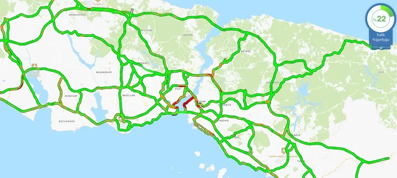 Trafik Yoğunluk Haritası'na göre, saat 15.17 itibariyle trafik yüzde 22 olarak ölçüldü.