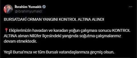 "Ekiplerimizin havadan ve karadan yoğun çalışması sonucu kontrol altına alınan Nilüfer ilçesindeki yangında soğutma çalışmalarımız devam etmektedir. Yeşil Bursa'mıza ve tüm Bursalı vatandaşlarımıza geçmiş olsun." ifadelerini kullandı.