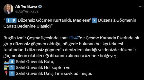 İçişleri Bakanı Ali Yerlikaya, İzmir'in Çeşme ilçesinde denizde düzensiz göçmenlerin olabileceği ihbarı üzerine yapılan çalışmayla 19 düzensiz göçmenin kurtarıldığını, 7 düzensiz göçmenin cansız bedenine ulaşıldığını açıkladı.