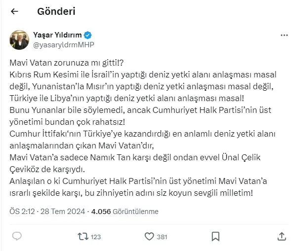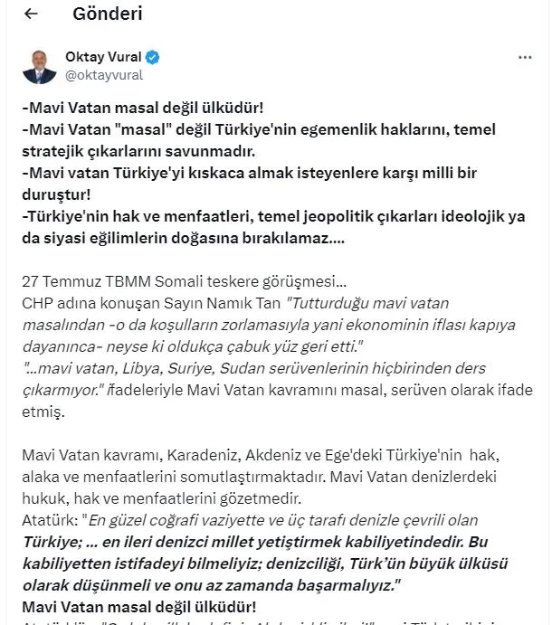 Milli siyasetimize karşı bu yaklaşımla konuşan bazı CHP milletvekillerinin, Türkiye'ye karşı başka devletler tarafından kullanılan sözde tezleri bu şekilde defalarca sahiplenmeleri, siyasi savrulma ve sorumsuzluktur. Mavi Vatanımız, Ana Vatanımızın ayrılmaz bir parçasıdır.